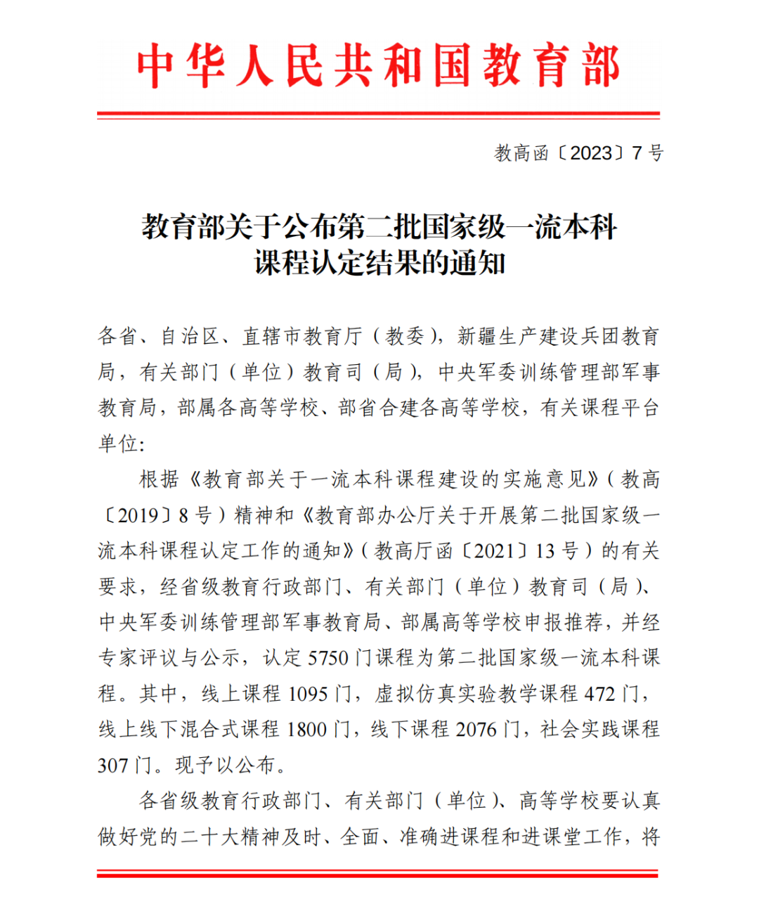 近日,教育部印发《关于公布第二批国家级一流本科课程认定结果的通知》(教高函〔2023〕7号),我校《水泵及水泵站》《高等数学》两门课程分别获批线上线下混合式和线下国家级一流本科课程,获批数量在全省民办高校位居前列。此次国家级一流本科课程的获批,体现了我校坚持“以本为本、四个回归”的阶段性成果,实现了我校一流课程建设的历史性突破。