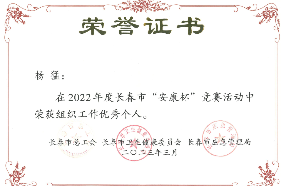 近日,我校保卫处副处长杨猛被长春市总工会、长春市卫生健康委员会和长春市应急管理局联合授予2022年度长春市“安康杯”竞赛组织工作优秀个人荣誉。