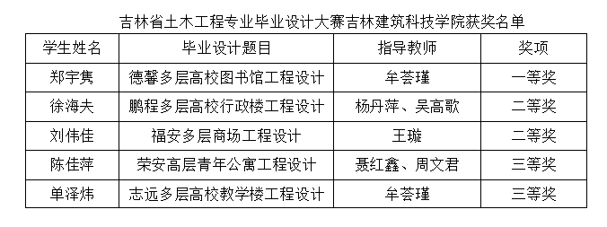 吉林省土木工程专业毕业设计大赛是由吉林省土木建筑学会承办的土木工程学科竞赛,每年举行一次。通过参加本次赛事,我校学生的专业知识得到了夯实和巩固,创新能力和实践能力也得到了提高。