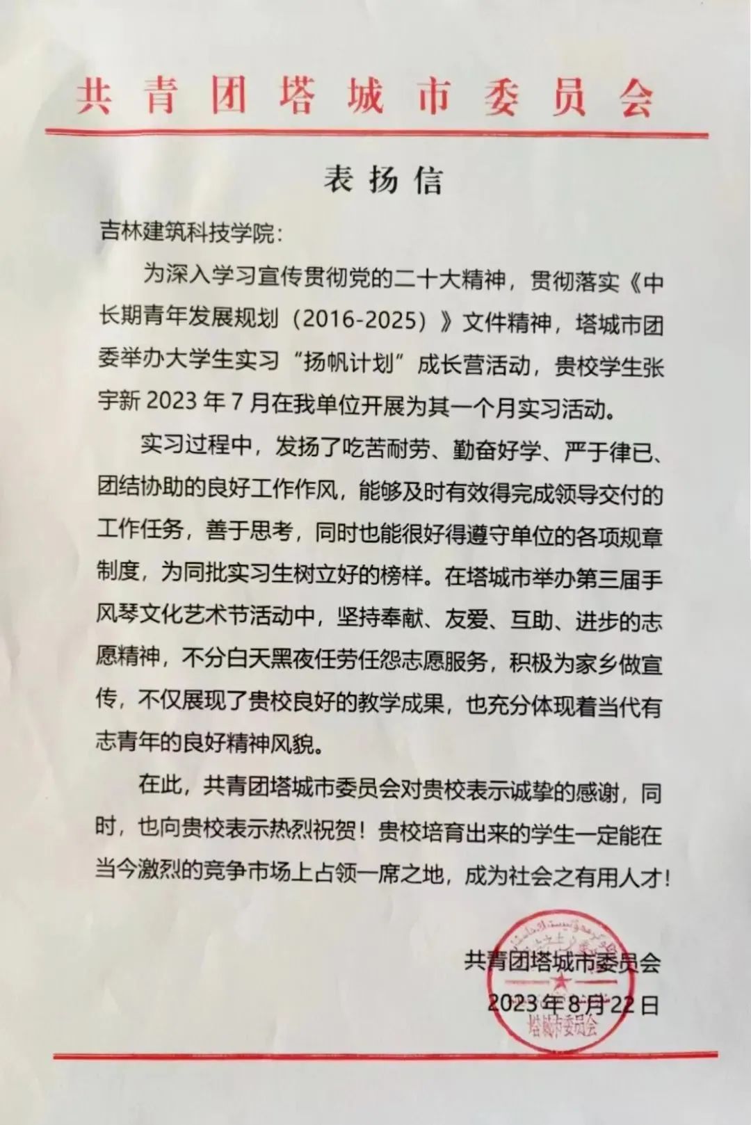 近日,我校收到了共青团塔城市委员会的一封表扬信。信中对我校土木工程学院2021级土木工程专业张宇新同学在塔城市团委举办的“扬帆计划”成长营活动中的优异表现给予了高度评价。表扬了张宇新同学积极弘扬“奉献、友爱、互助、进步”的志愿精神,充分肯定了我校在落实立德树人根本任务方面的显著成效,以及我校青年学生良好的精神风貌。