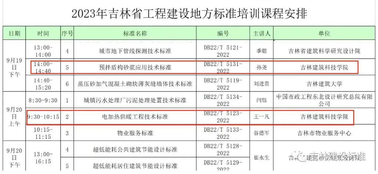 近日,吉林省住建厅发布了《吉林省住房和城乡建设厅关于开展吉林省工程建设地方标准培训的通知》。由我校主持编制、发布实施的两个吉林省工程建设地方标准列入此次培训计划,分别是由能源与环境工程学院王一凡老师(主要参编人)主讲的《电加热供暖工程技术标准》(DB22/T5123,主编陶进)和管理工程学院孙尧老师主讲的《预拌盾构砂浆应用技术标准》(DB22/T5131,主编孙尧)。
