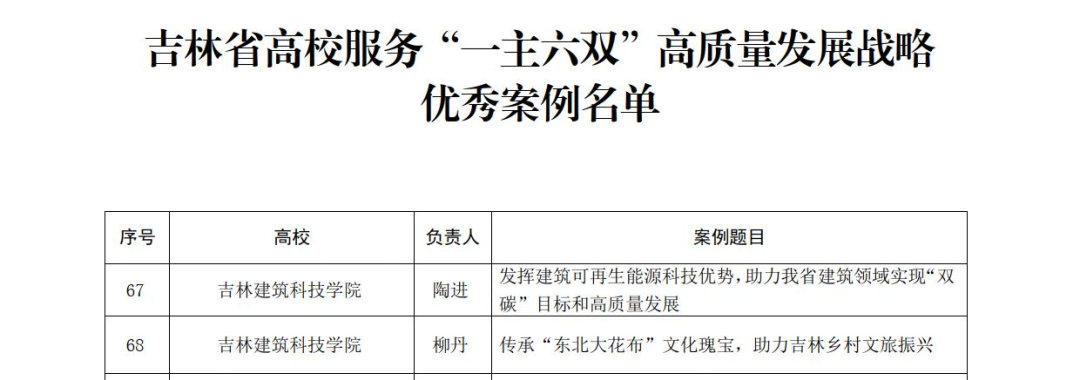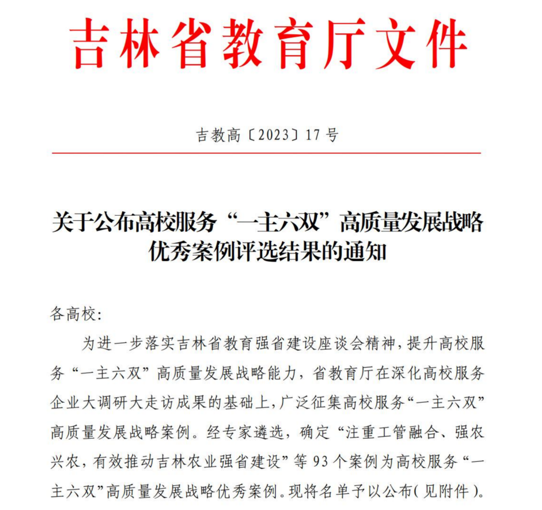 9月28日,吉林省教育厅发布了高校服务“一主六双”高质量发展战略优秀案例评选结果,我校的两个案例在全省高校推荐申报的300余个案例中脱颖而出,被评选为优秀案例,并纳入吉林省高校建设资源库,制作成果汇编,供高校相互学习借鉴。