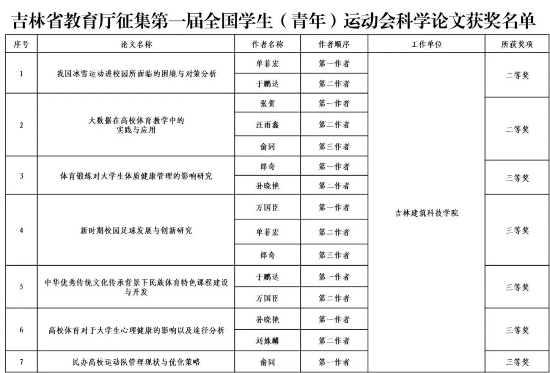近日,吉林省教育厅公布了征集第一届全国学生(青年)运动会科学论文的评选结果,吉林建筑科技学院申报的7篇论文全部获奖,获奖总数位列全省民办高校首位!其中二等奖2项,三等奖5项。