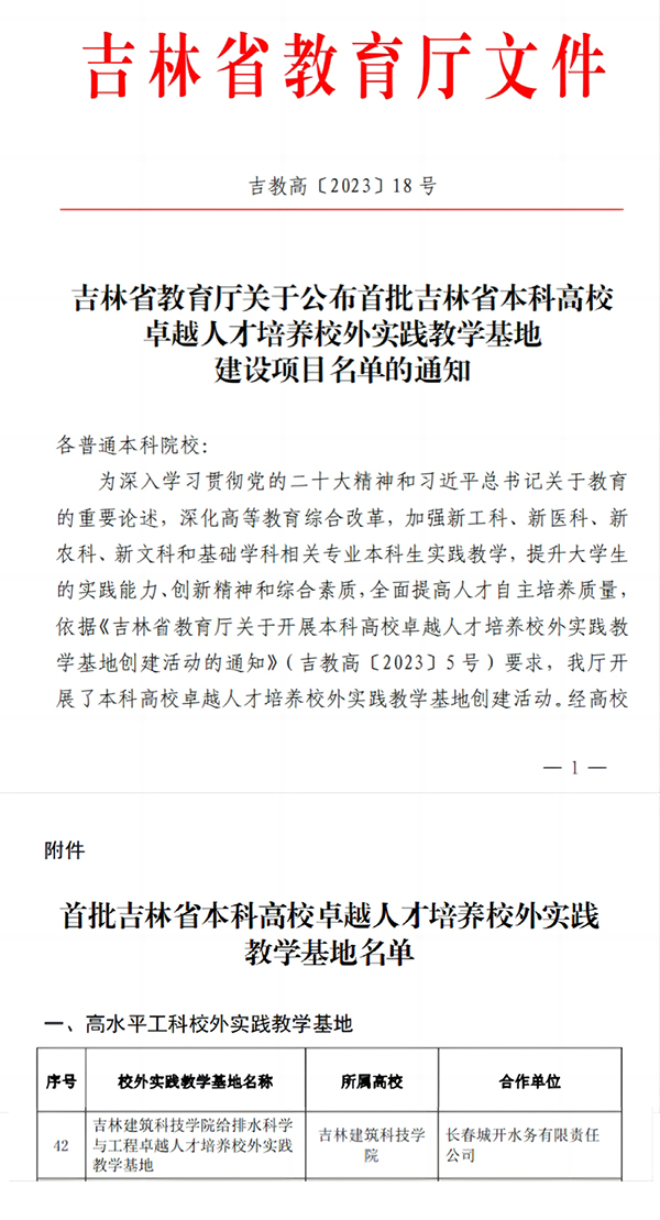近日,吉林省教育厅发布了《吉林省教育厅关于公布首批吉林省本科高校卓越人才培养校外实践教学基地建设项目名单的通知》(吉教高[2023]18号),我校“给排水科学与工程卓越人才培养校外实践教学基地”获批为首批吉林省本科高校卓越人才培养校外实践教学基地。