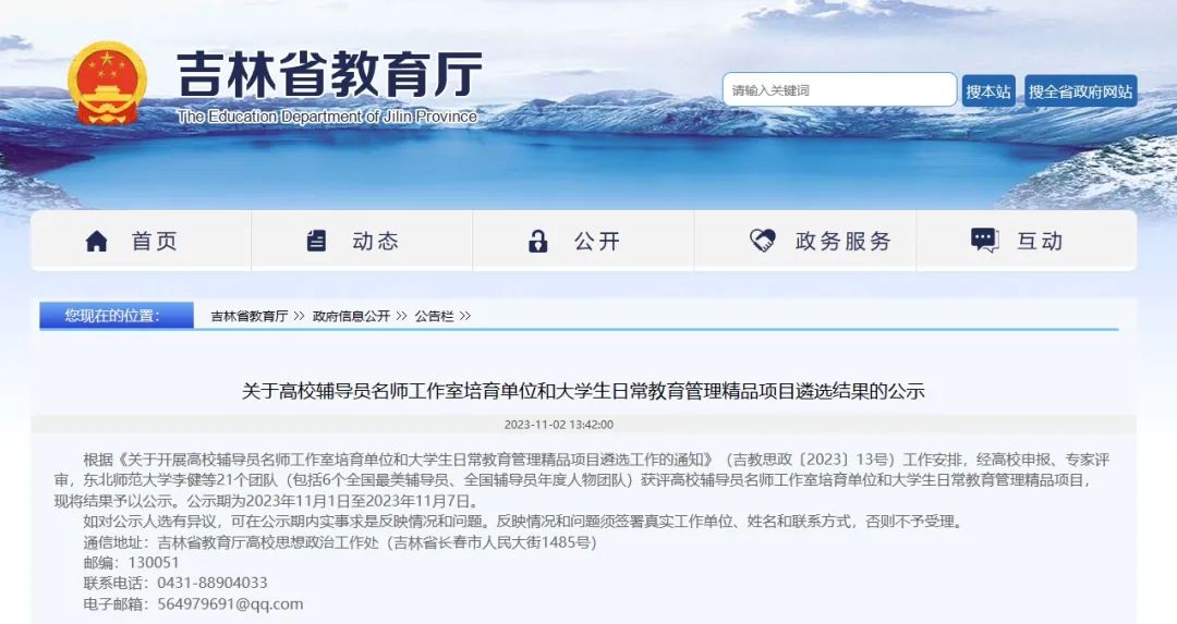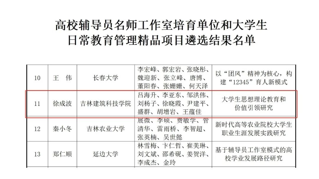 近日,吉林省教育厅公布了《关于高校辅导员名师工作室培育单位和大学生日常教育管理精品项目遴选结果的公示》,经过各高校的申请和专家评审,吉林省高校共有21个团队(包括6个全国最美辅导员、全国辅导员年度人物团队)被评选为高校辅导员名师工作室培育单位和大学生日常教育管理精品项目。吉林建筑科技学院成功获评吉林省高校辅导员名师工作室培育单位。