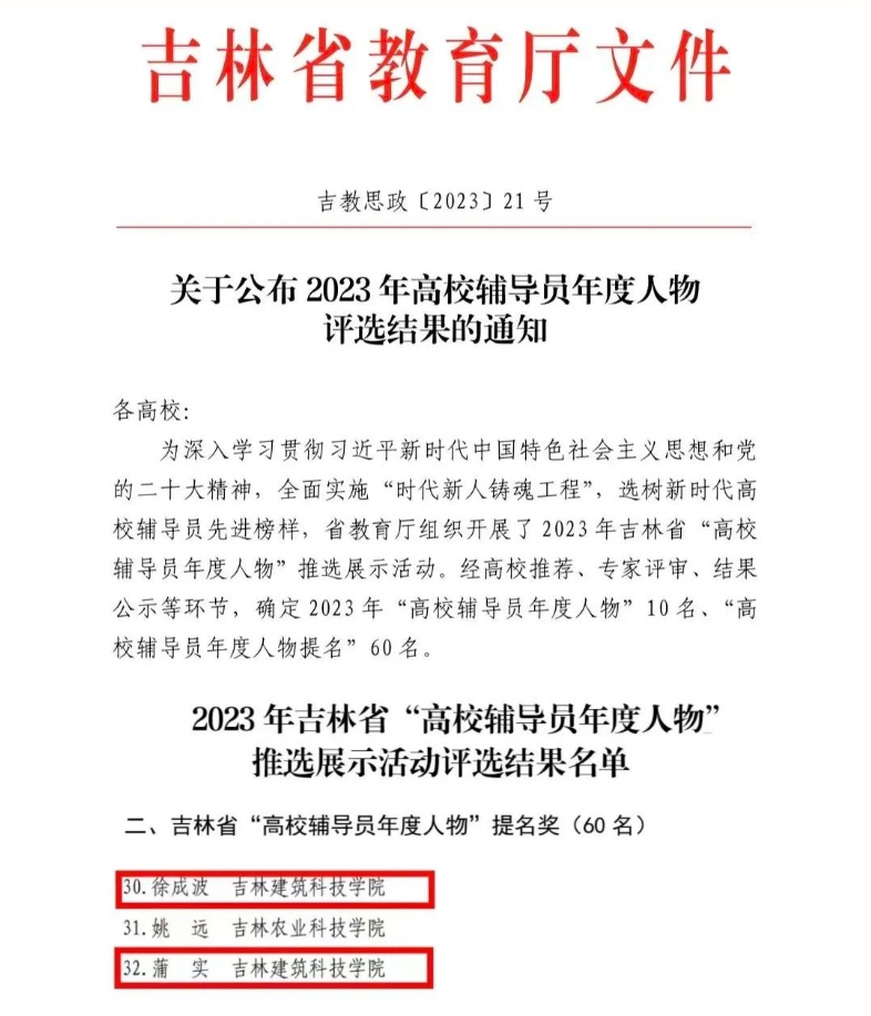 近日,吉林省教育厅公布了2023年吉林省“高校辅导员年度人物”推选展示活动的评选结果。在本次评选中,我校辅导员徐成波、蒲实荣获2023年吉林省“高校辅导员年度人物”提名奖。