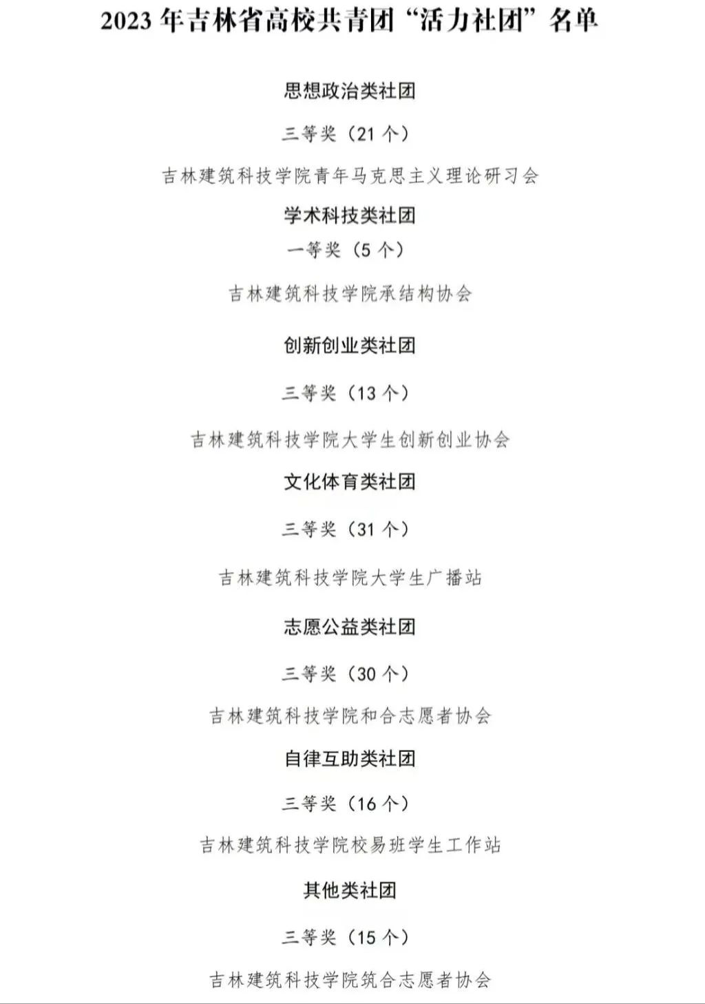学术科技类社团评选中,吉林建筑科技学院承结构协会荣获一等奖。