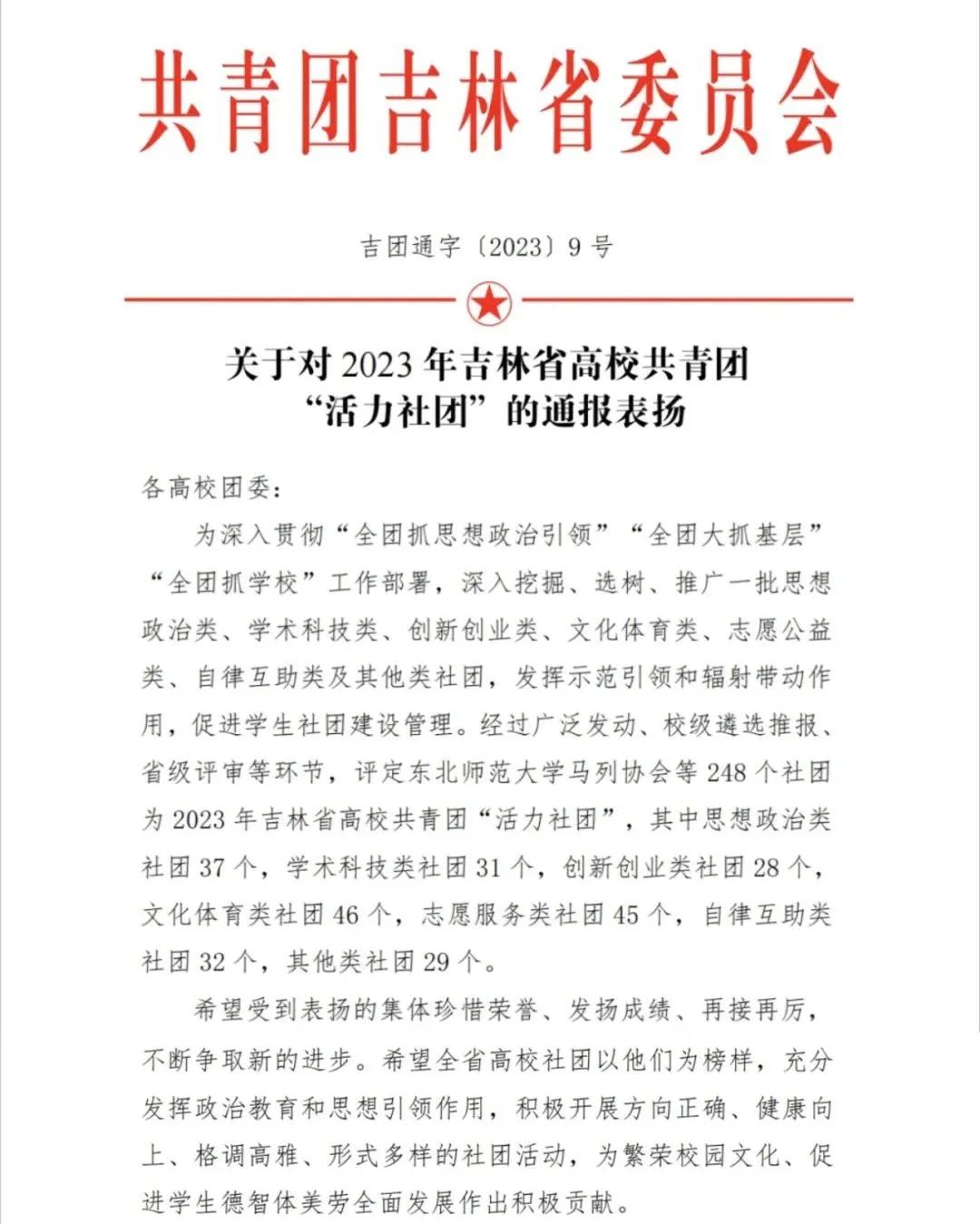 近日,共青团吉林省委员会公布了2023年吉林省高校共青团“活力社团”评定名单。在此次评定中,学校7个社团被评为吉林省高校共青团“活力社团”。