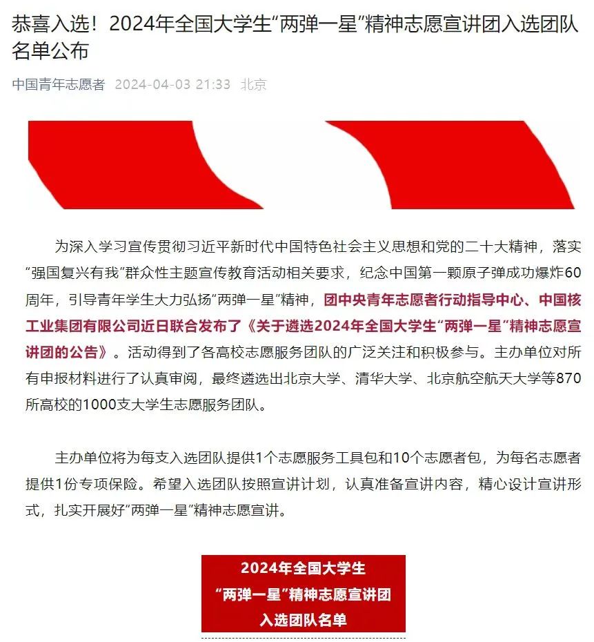 为纪念中国第一颗原子弹成功爆炸60周年,激发青年学生大力弘扬“两弹一星”精神,团中央青年志愿者行动指导中心与中国核工业集团有限公司联合举办2024年全国大学生“两弹一星”精神志愿宣讲活动。我校电气与机械工程学院团委和信合志愿者协会积极组织申报,最终成功入选。