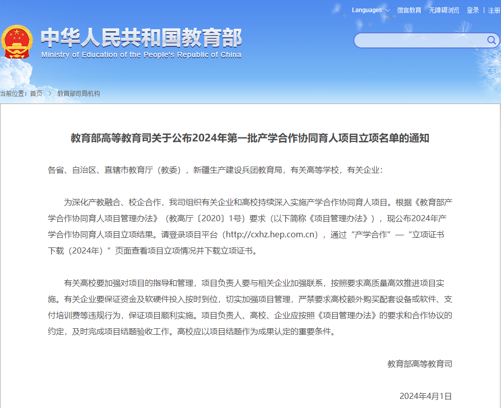 教育部产学合作协同育人项目是教育部贯彻落实《国务院办公厅关于深化产教融合的若干意见》(国办发〔2017〕95号)、《教育部工业和信息化部中国工程院关于加快建设发展新工科实施卓越工程师教育培养计划2.0的意见》(教高〔2018〕3号)等文件精神,为探索校企合作新模式和创新创业教学改革新方式,联合国内外知名企业推出的新型人才培养项目,是高校深化产教融合、增强人才自主培养能力的重要载体,有助于发挥企业先进的技术、研发和产品优势,以产业发展的最新需求推动高校人才培养模式改革。