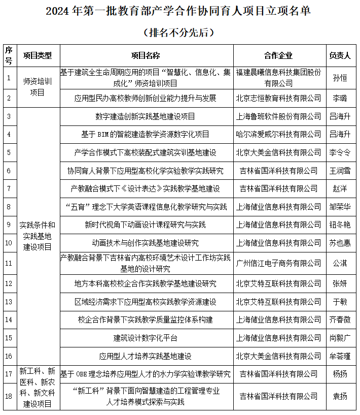近日,教育部高等教育司下发了《关于公布2024年第一批产学合作协同育人项目立项名单的通知》,我校与哈尔滨爱威尔科技有限公司合作的“基于BIM的智能建造教学资源数字化项目”等18个项目成功获批,其中实践条件和实践基地建设项目14项、师资培训项目2项、“新工科、新医科、新农科、新文科建设项目”项目2项。