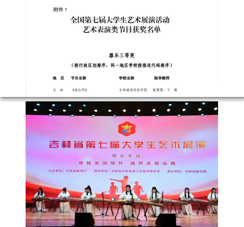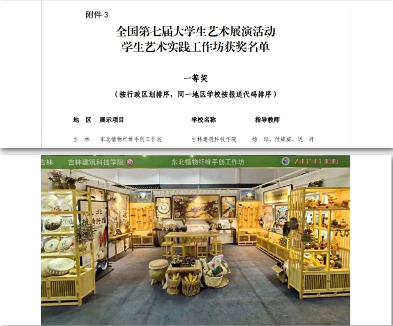 6月11日,教育部公布了《关于全国第七届大学生艺术展演活动各项目评选结果的公示》。学校作品《东北植物纤维手创工作坊》荣获学生艺术实践工作坊类一等奖,民乐合奏《战台风》获得艺术表演类节目器乐类三等奖。