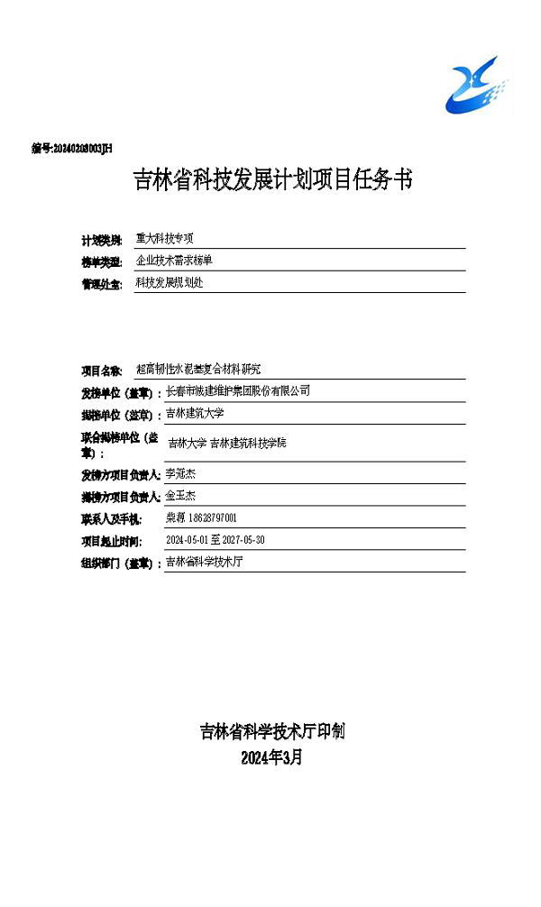 近日,吉林省科技厅公布了2024年度第一批吉林省科技发展计划揭榜挂帅(军令状)机制项目立项名单。由长春市城建维护集团股份有限公司作为发榜单位,吉林建筑大学牵头、吉林大学和我校参与作为揭榜单位的“超高韧性水泥基复合材料研究”项目获批立项。该项目我校项目负责人为土木工程学院王淑娟老师,项目总体经费240万元,我校获批24万元。