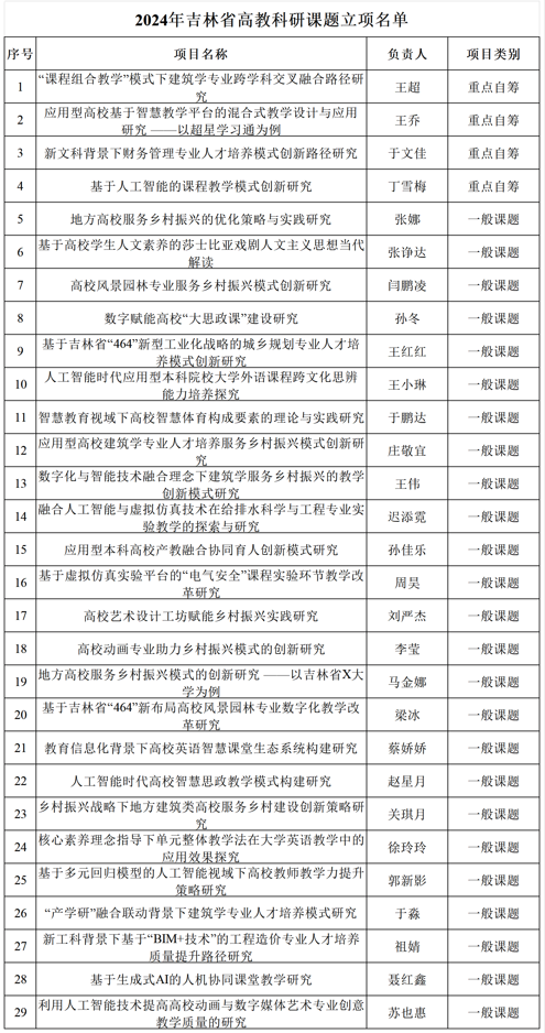 近日,吉林省高等教育学会发布了《关于公布2024年度吉林省高教科研课题立项通知》。我校在此次评选中共有29项课题成功获批立项,其中重点自筹课题4项、一般课题25项。