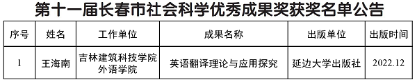 近日,第十一届长春市社会科学优秀成果奖评选结果正式公布,我校外语学院教师王海南申报的成果《英语翻译理论与应用探究》荣获著作类三等奖。