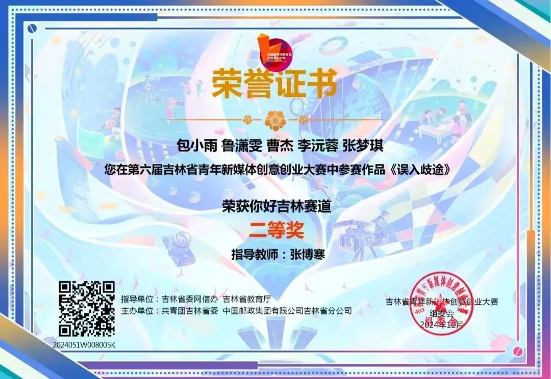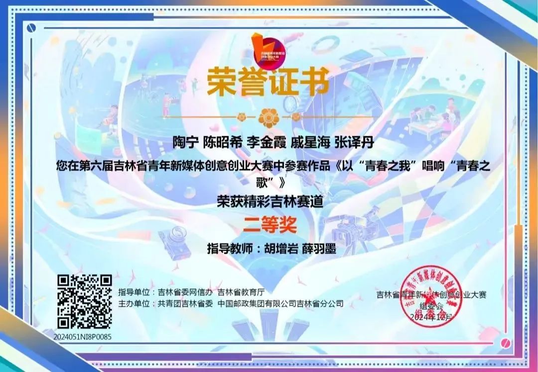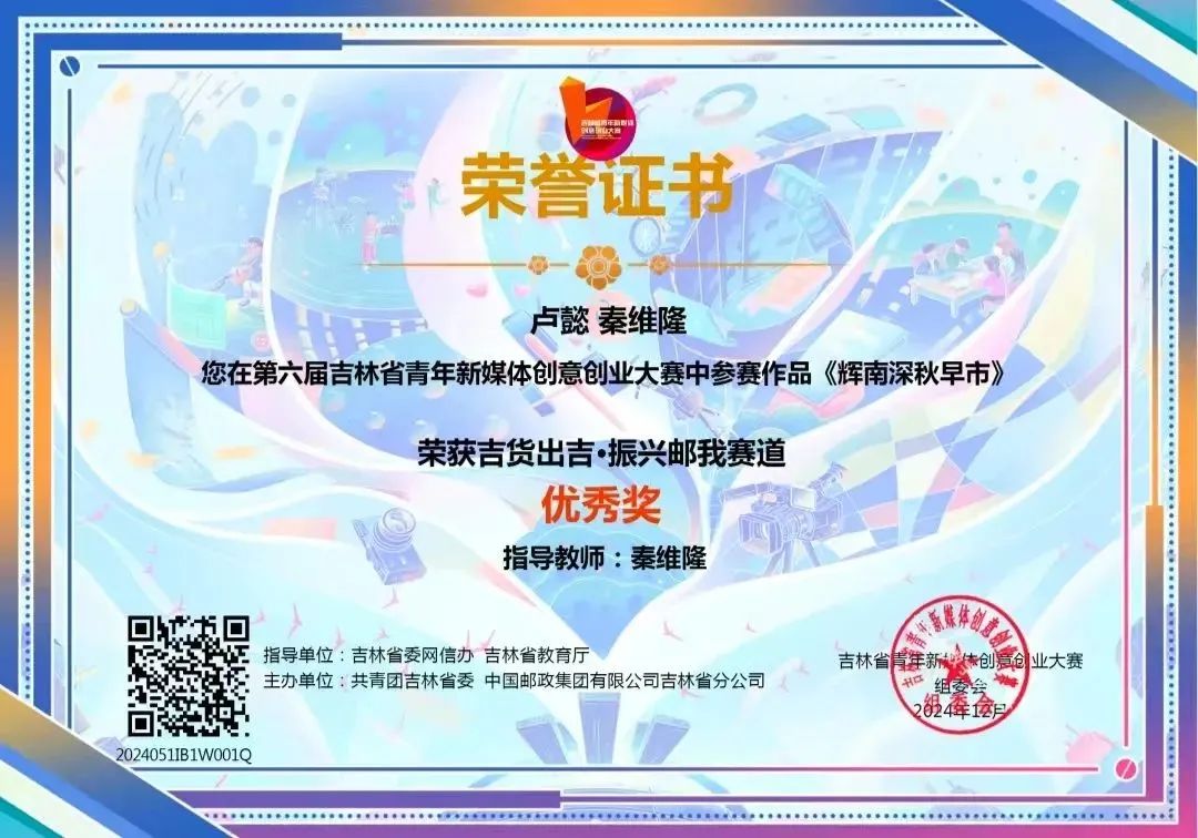 此次大赛以“大美·吉林”“红色·吉林”“速度·吉林”“青春·吉林”为主题,吸引了全省高校众多新媒体创意人才参与。经过激烈角逐,学校参赛作品脱颖而出。其中,由张博寒指导的作品《误入歧途》获“你好吉林”赛道二等奖;胡增岩、薛羽墨指导的作品《以“青春之我”唱响“青春之歌”》获“精彩吉林”赛道二等奖;秦维隆指导的作品《辉南深秋早市》获“吉货出吉•振兴邮我”赛道优秀奖。