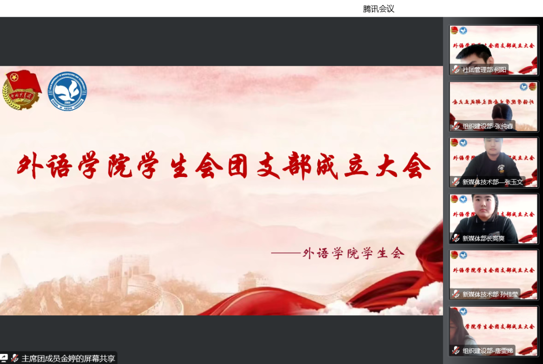 为深入贯彻落实团中央关于《关于改革创新高校共青团工作切实增强思想政治引领实效的若干举措》有关精神,进一步加强共青团基层组织建设和组织延伸,强化共青团组织对学生会的引导作用,外语学院学生会于12月14日组织召开线上团支部成立大会。大会由外语学院执行主席张阳主持,全体学生会成员参加。