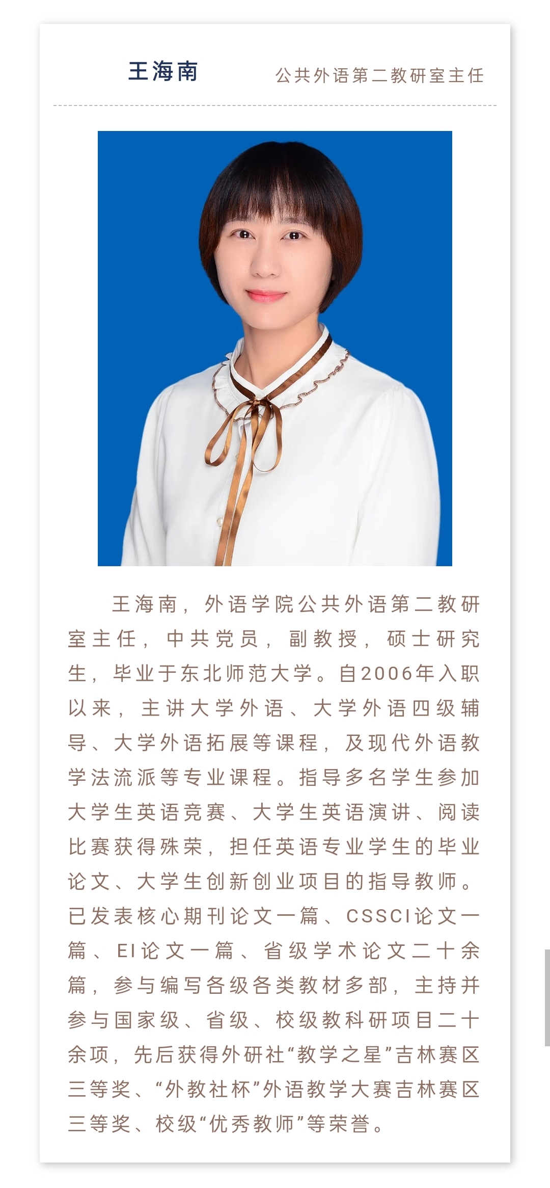 王海南,外语学院公共外语第二教研室主任,中共党员,副教授,硕士研究生,毕业于东北师范大学。自2006年入职以来,主讲大学外语、大学外语四级辅导、大学外语拓展等课程,及现代外语教学法流派等专业课程。指导多名学生参加大学生英语竞赛、大学生英语演讲、阅读比赛获得殊荣,担任英语专业学生的毕业论文、大学生创新创业项目的指导教师。已发表核心期刊论文一篇、CSSCI论文一篇、EI论文一篇、省级学术论文二十余篇,参与编写各级各类教材多部,主持并参与国家级、省级、校级教科研项目二十余项,先后获得外研社“教学之星”吉林赛区三等奖、“外教社杯”外语教学大赛吉林赛区三等奖、校级“优秀教师”等荣誉。