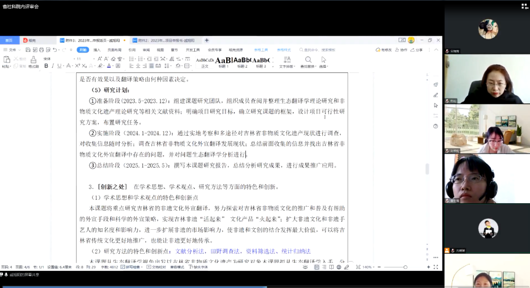本次评审会共征集院级科研课题6项,课题主要围绕吉林省经济文化发展,着力研究有吉林省特色的物质文化外宣翻译。在评审会上,评审专家就选题依据、相关研究的学术史梳理及研究动态、学术及应用价值、研究思路、重点难点、主要目标、研究计划等方面逐一进行点评,还特别针对课题申报书撰写中存在的具体问题逐一排查、问诊把脉、对症下药,提出了完善和修改意见,强化了教师在课题申报的科学性和规范性。