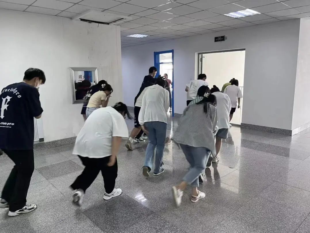 演练开始后,消防警报即拉响,实验室安全员立刻到达指定疏散楼梯口,学生按照正确的逃生方式,沿逃生线路有序快速的分流疏散撤离。