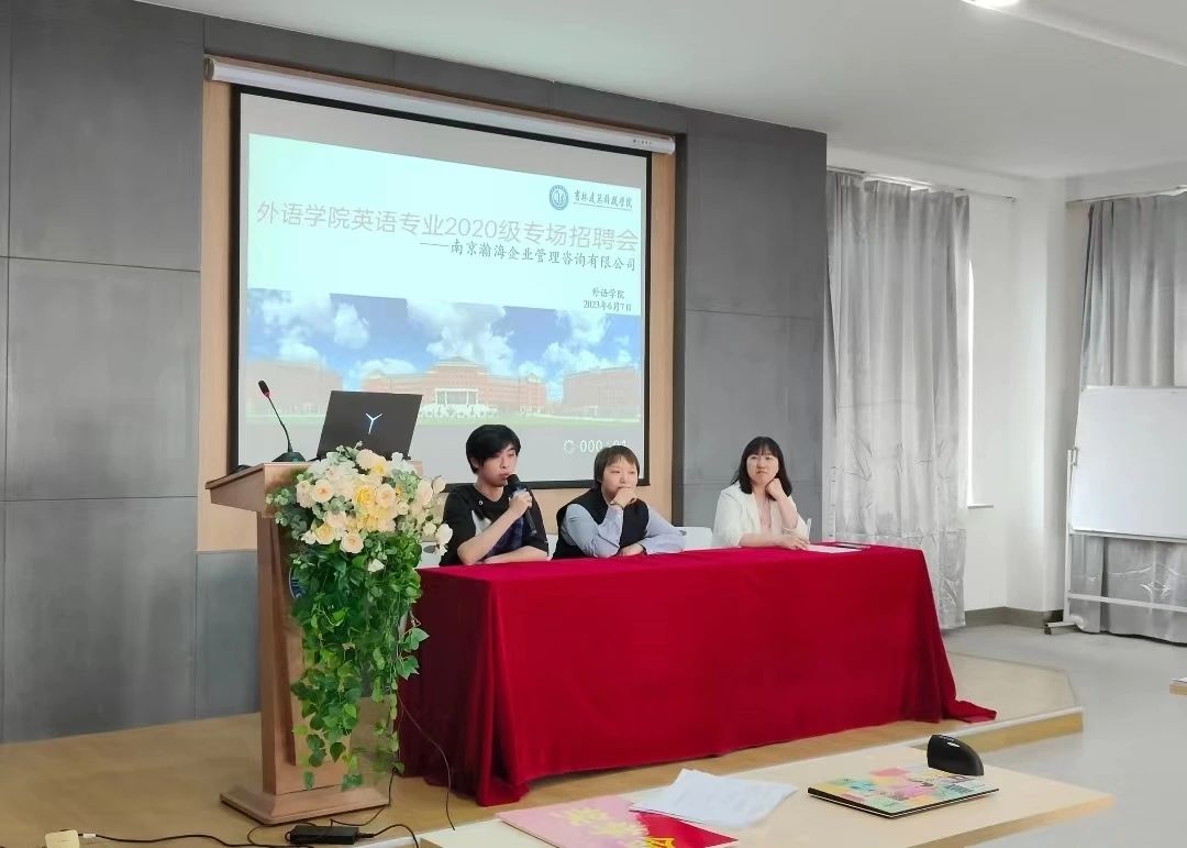 为促进学生多渠道就业创业,实现更高质量的就业目标,外语学院于2023年7月5日在文管楼509教室召开山东人才发展集团专场招聘会,会议由山东人才发展集团HR刘黎静老师主讲,外语学院2021级全体学生参与会议,会上刘黎静老师就公司社会背景,工作环境,公司特色与优势,实习待遇及招聘要求进行逐一介绍与分享。