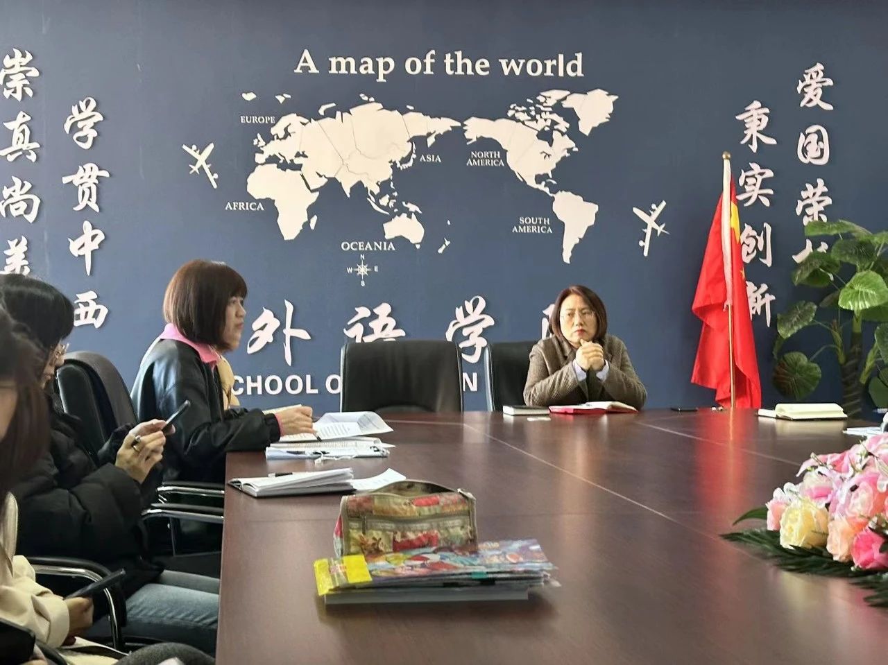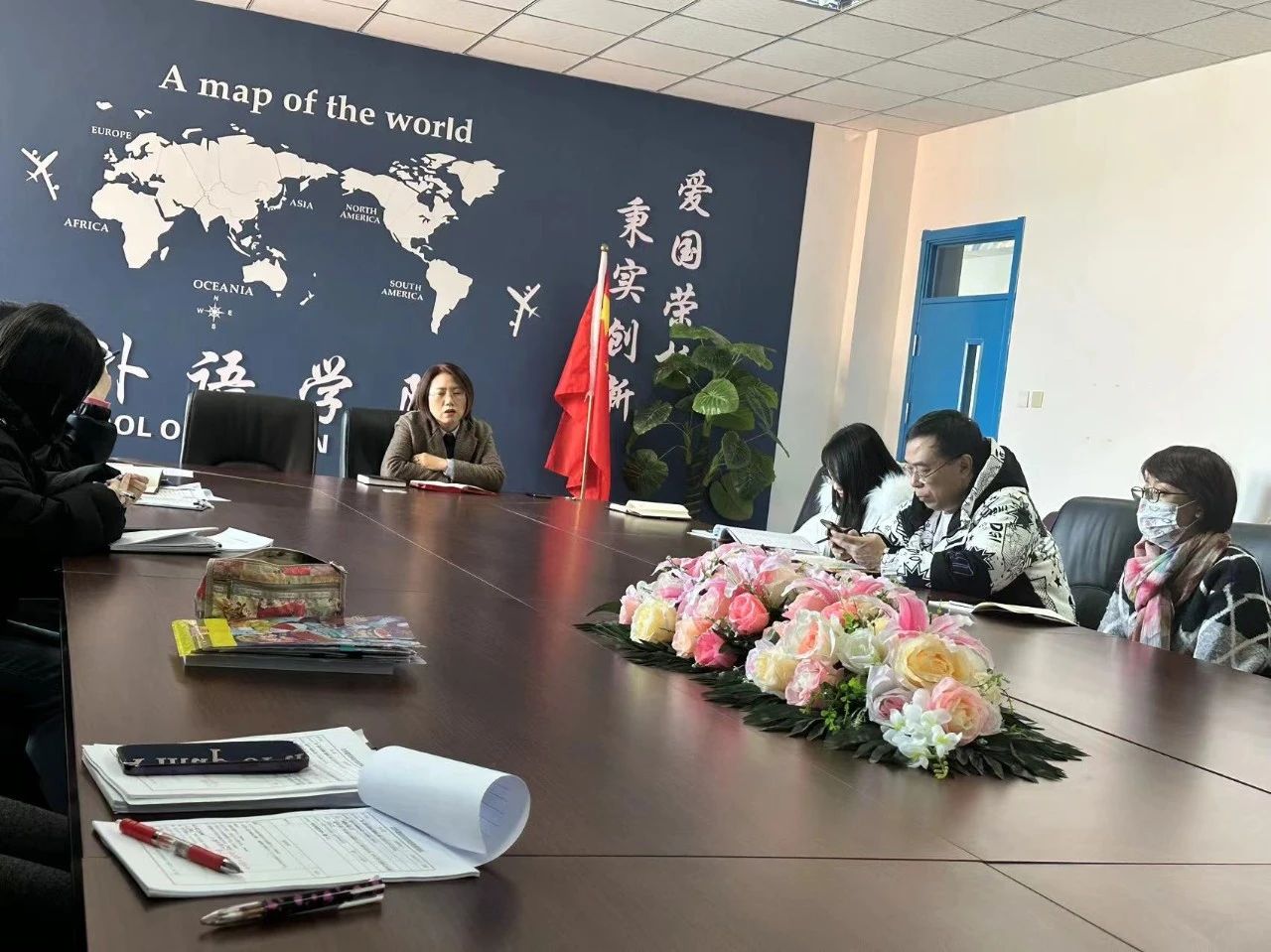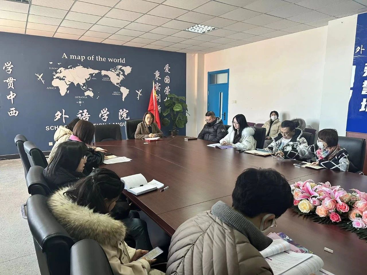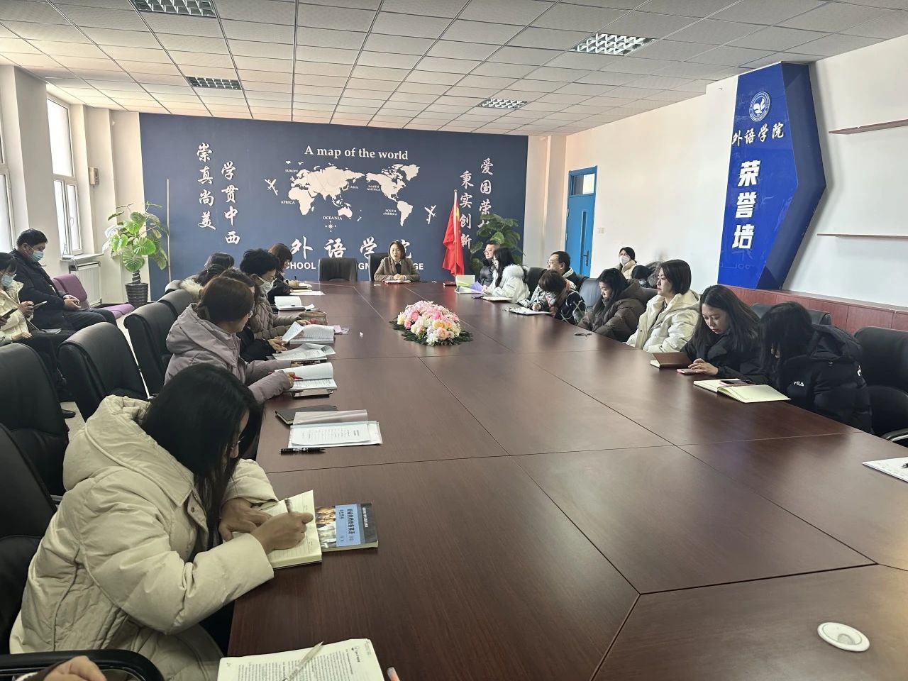 为进一步贯彻落实学校新学期教育教学工作会议精神,2024年3月1日下午,外语学院全体教师在文管楼407会议室召开春季学期即新学期第一次教学工作例会。会议由韩松院长主持,学院党总支副书记陈超、副院长李晓雨、院长助理齐媛媛以及全体教师共同参加了此次会议。
