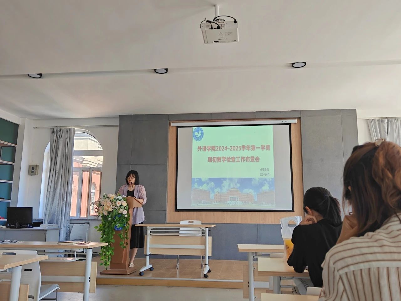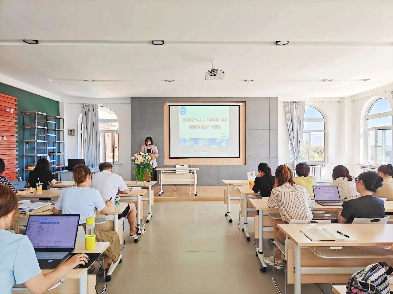 2024年8月28日下午,外语学院在学院会议室召开了2024-2025学年第一学期期初教学检查工作布置会。会议由李晓雨副院长主持,院长助理齐媛媛、各教研室主任及全院教师共同参加。