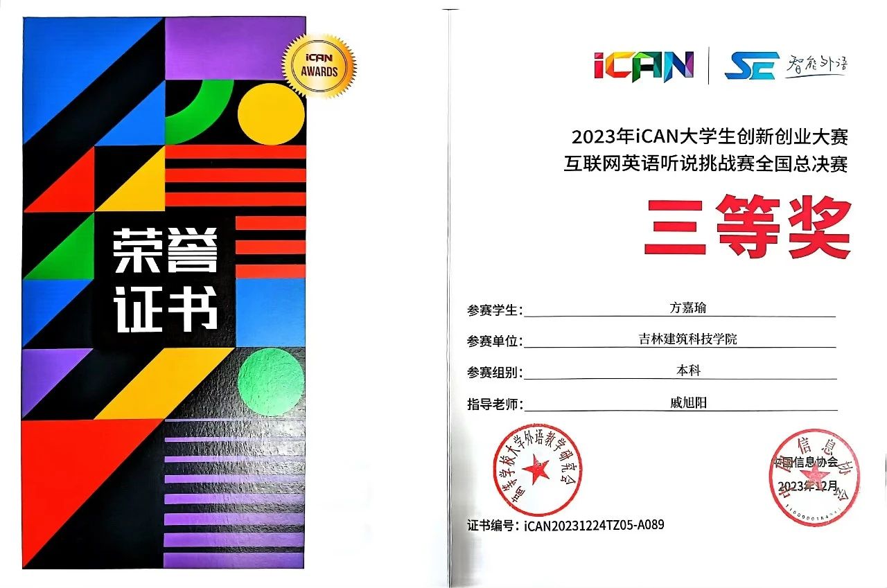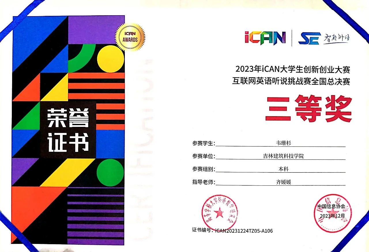 3、获得“外研社·国才杯”全国英语演讲大赛省级复赛吉林省二等奖1名,三等奖4名;写作大赛省级复赛吉林省一等奖2名;阅读大赛省级复赛吉林省一等奖3名。2023年首次举办的“外研社·国才杯”全国英语口译比赛取得了省级金奖、国家级三等奖的优秀成绩,建校以来首次入围外语类学科竞赛国赛;此外,英专学生还首次参加了第六届“外教社杯”全国高校学生跨文化能力大赛和iCAN大学生创新创业大赛互联网英语听说挑战赛,并斩获2项国家级奖项,取得了喜人的成绩。学生的实践创新能力亦通过比赛和项目得到了促进。近3年来,英语专业学生共计完成省级及以上大学生创新创业项目14项,在创新与创业两个维度上的成果均有所斩获;学生以团队形式参加第四届吉林省电子商务案例分析大赛,并取得了一等奖1项,二等奖1项的优异成绩。