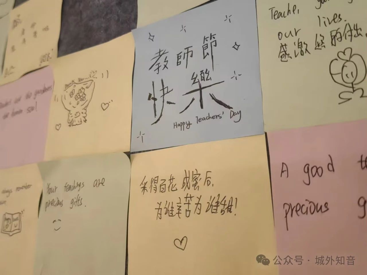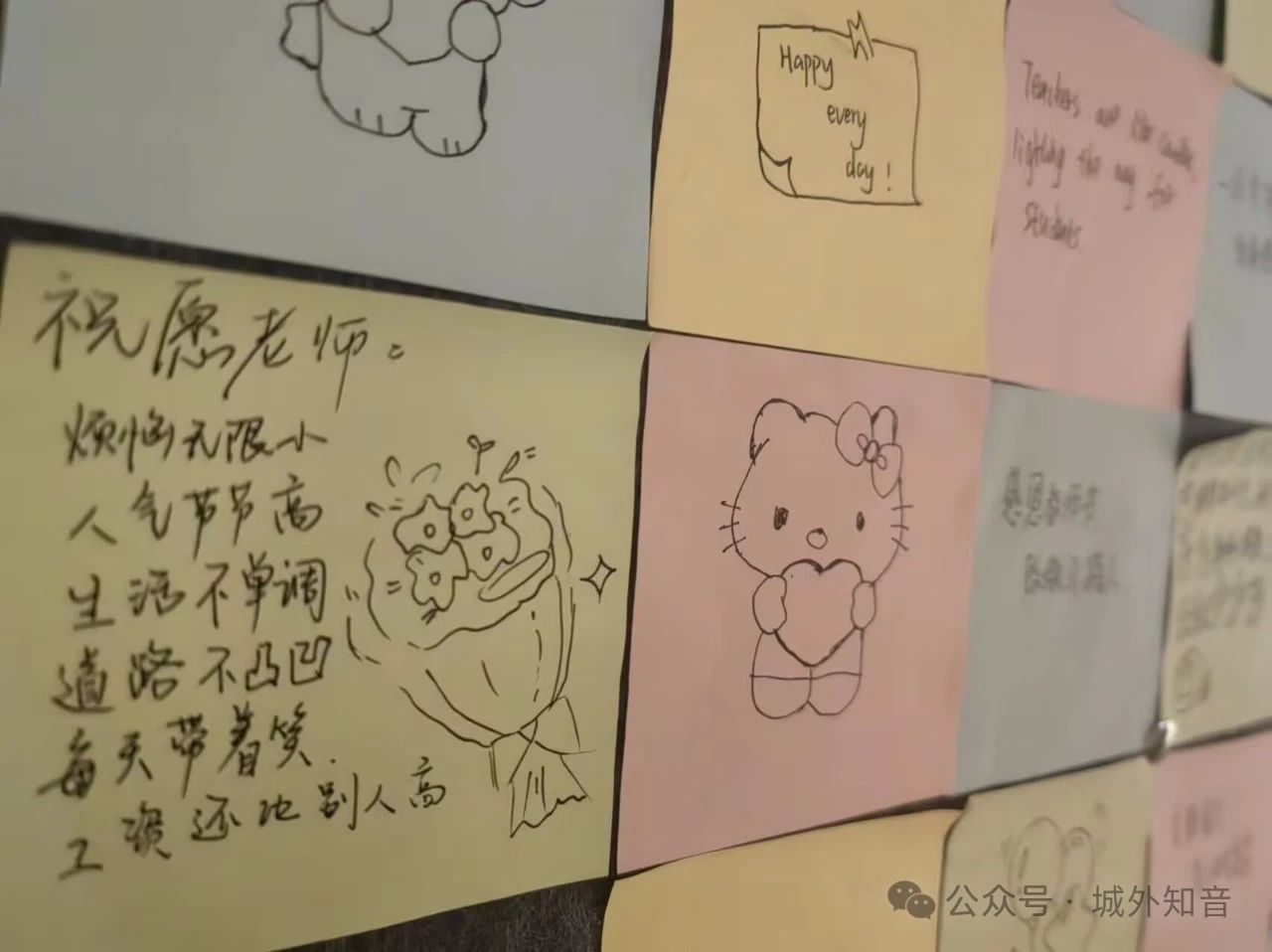 浓浓关怀暖师心,殷殷期许催人进。同学们用一张张便签写下对老师的感谢,用一张张便签表达想对老师说的话,大家的感情都凝聚在其中。一句句动情的祝福,希望能让老师感受到片刻的幸福。