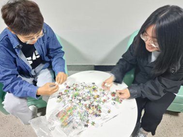 首先,在本次活动周过程中,学院设计了两组团训活动,分别是“拼图大作战”和“心理自画像”:在“拼图大作战”环节中,同学们随机分配为10人一组,把一幅1000块的拼图打散,分成10份,让每个小组的成员依次接力去完成拼图,这个项目重点考验团队成员之间的默契和合作能力,让成员们明白团队的成功是每个成员努力的累积,而且需要高效的衔接。