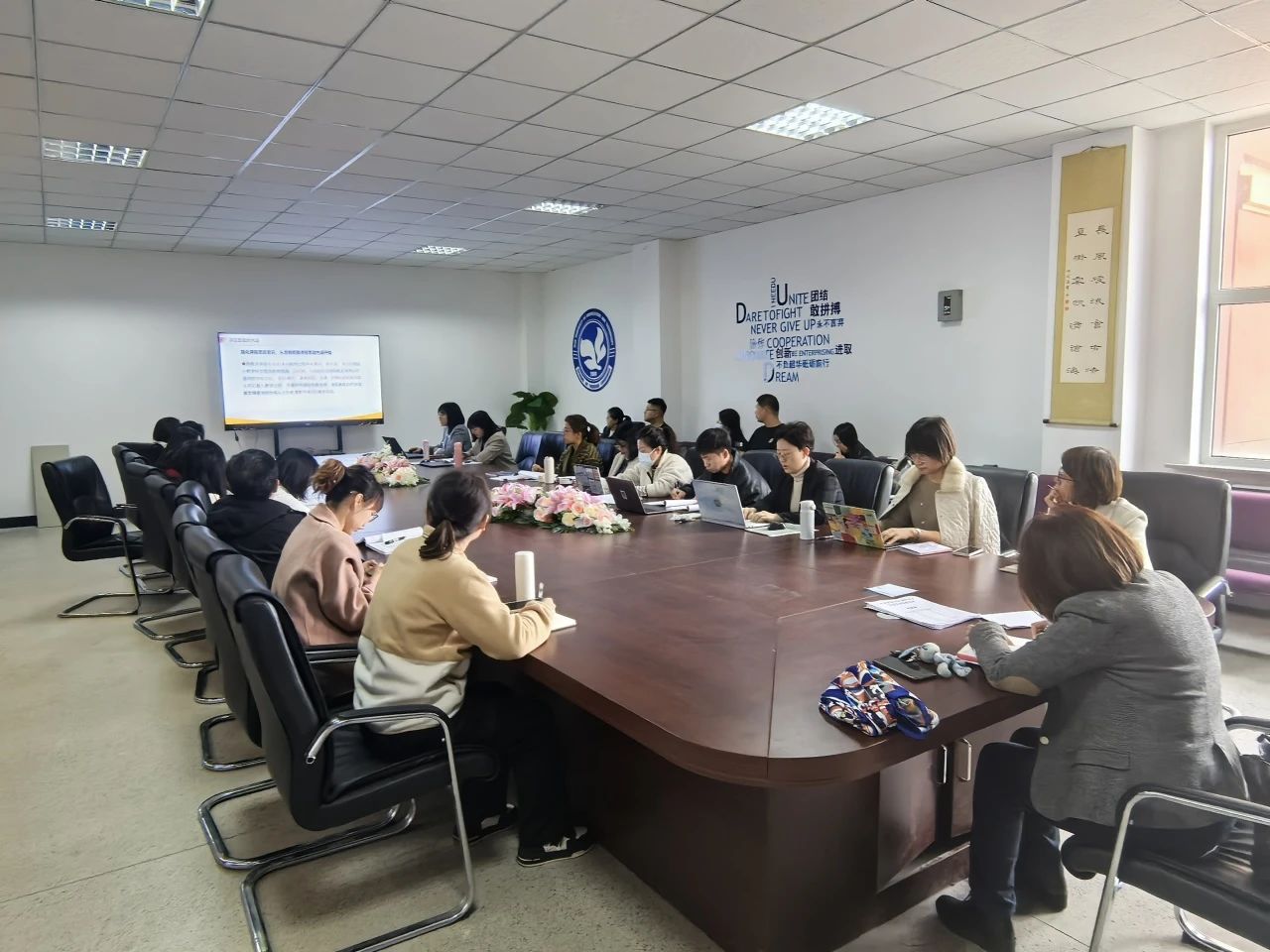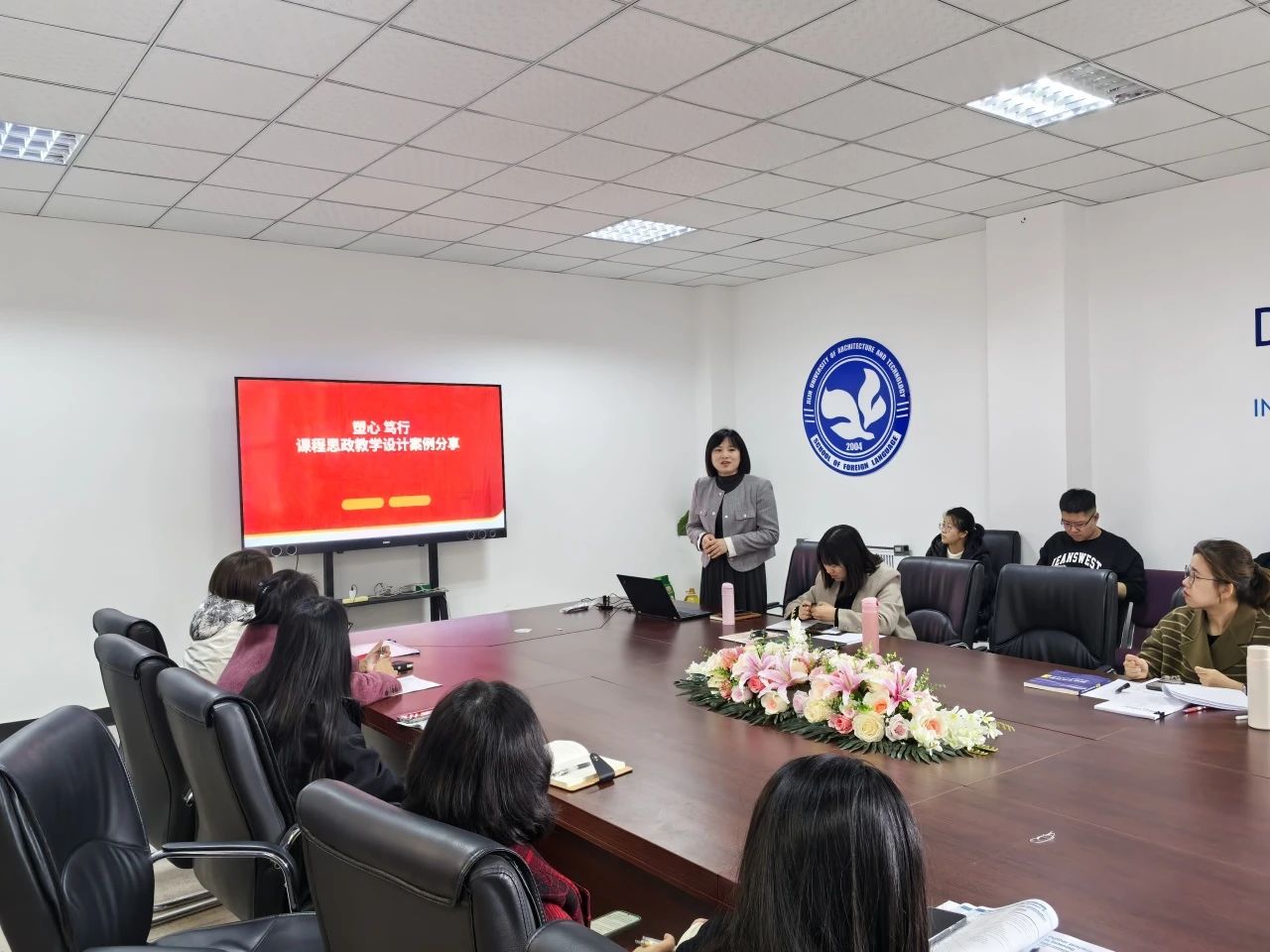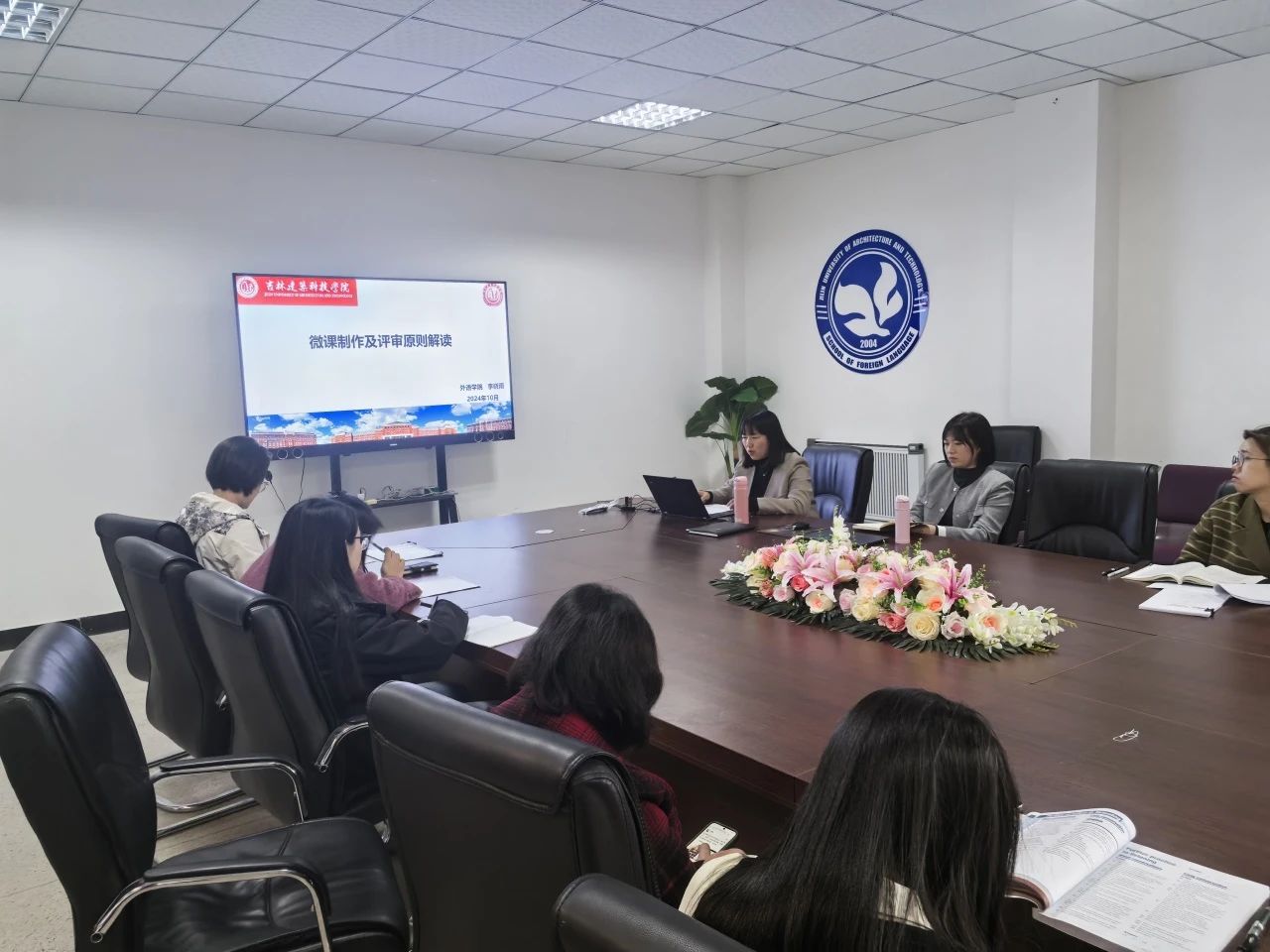 最后,齐教授分享了多个课程思政教学案例,覆盖了不同学科和课程类型。她细致地分析了每个案例的设计思路、实施过程和教学效果,为在场教师提供了宝贵的经验和启示。为促进外语学院教师之间知识分享、经验交流与思想碰撞,外语学院于2024年10月25日下午在文管楼407组织召开了外语学院“以赛促教”教师专业素质提升工作坊沙龙活动,院长韩松、副院长李晓雨、院长助理齐媛媛及全体教师参加了本次沙龙。