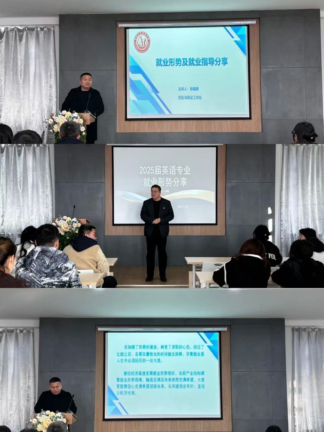 为有效提升2025届毕业生就业意识,了解当前就业市场形势,外语学院于2024年11月13日14:30在文管楼509报告厅组织召开了就业形势宣讲培训会。会议由外语学院党总支副书记陈超主持,招生与就业工作处就业市场科科长张福顺、毕业生辅导员邱源及英语专业2021级全体在校学生参会。