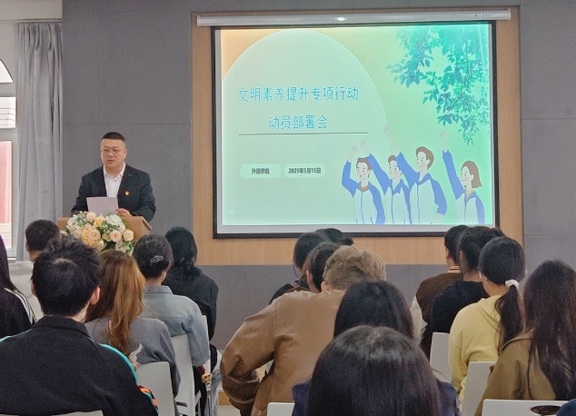 5月15日12点,外语学院在学院509报告厅组织召开了学生文明素养提升专项行动动员部署会,旨在深入贯彻学校相关方案要求,全面提升学生文明素养,为本科教学工作合格评估助力添彩。此次会议由学院党总支副书记陈超主持,学院全体团学干部参会,会议现场气氛热烈,充分展现出师生积极参与行动的决心。
