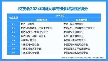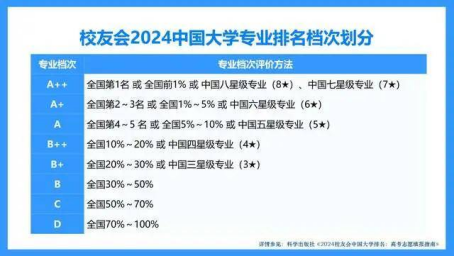 校友会2024中国大学一流专业排名坚持实施分类分级分档评价,依据中国大学办学定位、学科专业建设水平和本科专业发展定位,按研究型和应用型2个类型进行评价。依据中国大学专业排名位次、位次百分比与星级排名,将中国大学本科专业分为A++、A+、A、B++、B+、B、C、D等8个档次。