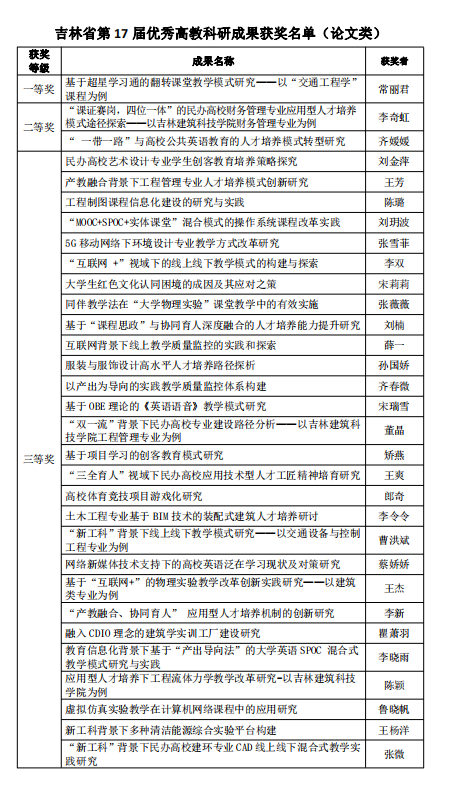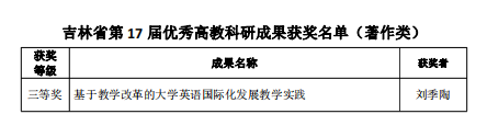 近日,吉林省高等教育学会公布第十七届优秀高教科研成果评奖结果,我校共计32项成果获奖,其中一等奖1项、二等奖2项、三等奖29项,在吉林省同类院校中名列前茅。