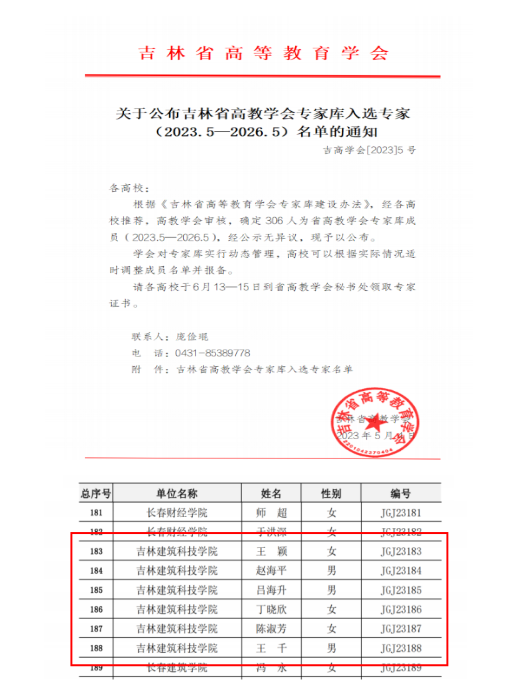 日前,吉林省高等教育学会发布了《关于公布吉林省高教学会专家库入选专家(2023.5-2026.5)名单的通知》。经学校推荐、省高教学会评审,我校王颖、赵海平、吕海升、丁晓欣、陈淑芳、王千6位教授入选吉林省高教学会专家库。