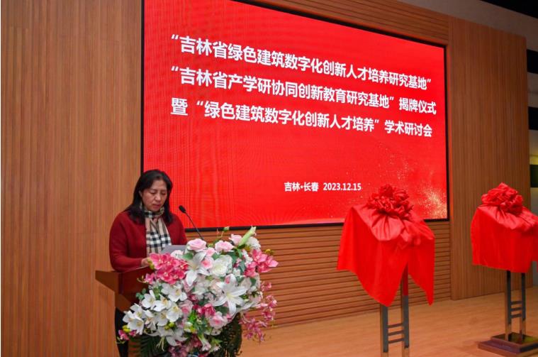 随后,吉林省教育科学研究领导小组办公室主任周颖华宣读了《关于批准吉林省教育科研基地及立项建设基地(单位)的决定》。郭天宝院长、周颖华主任、赵海平副校长分别为“吉林省绿色建筑数字化创新人才培养研究基地”“吉林省产学研协同创新教育研究基地”揭牌。
