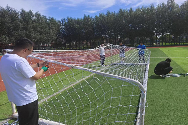 检查足球球门和安装球网