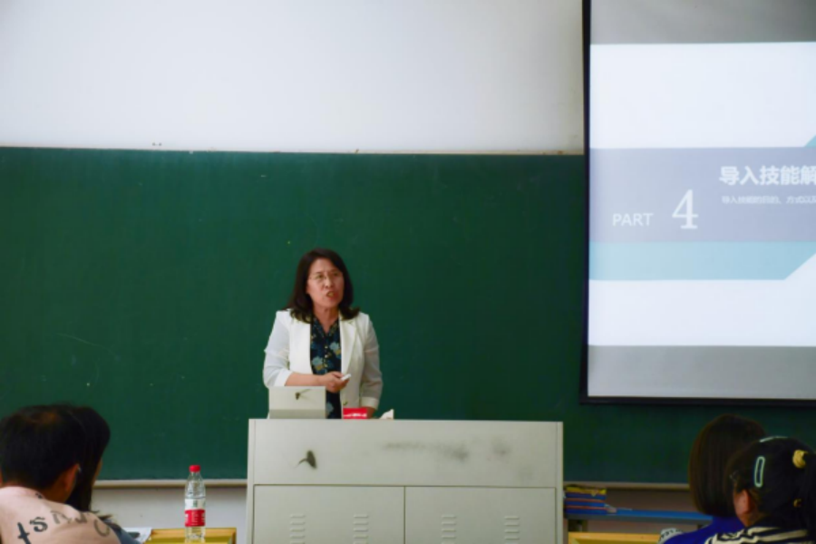接下来,郭继秋教授带领全体新教师一起进入课堂导入技能解析与实践环节,尚毅广助理从旁协助。郭教授首先对教师的教姿教态做扼要说明。她强调,教姿教态是教学语言的重要组成部分,它是有声语言信息传递的重要辅助手段,是教学艺术性的重要表达手段之一,它的优良与否直接影响课堂效果。同时,郭教授指出,良好的开端是成功的一半,由此,郭教授引入本次活动核心。郭教授聚焦本次训练主题,引导受训教师围绕课堂教学导入的目的、导入的类型、导入的技能及应用要点等内容展开了激烈的探讨。活动现场气氛十分热烈,教师们积极参与,踊跃将自己的所学、所思、所想付诸实践,并在实践中进一步掌握导入的思路与技巧。通过组内讨论、组间评价及专家点评,教师们对于课堂教学导入的理解更为深刻,对提高自身的教学能力与水平具有重要意义。