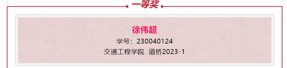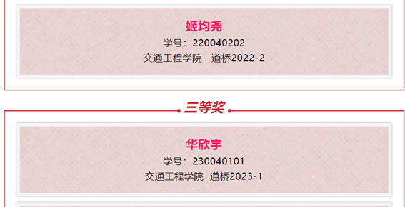 我院道路桥梁与渡河工程专业2023级学生徐伟超在大赛中荣获一等奖、道路桥梁与渡河工程专业2022级学生姬均尧荣获二等奖、道路桥梁与渡河工程专业2023级学生华欣宇荣获三等奖。