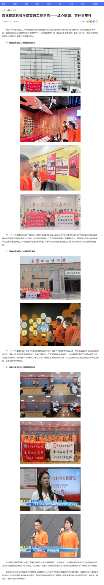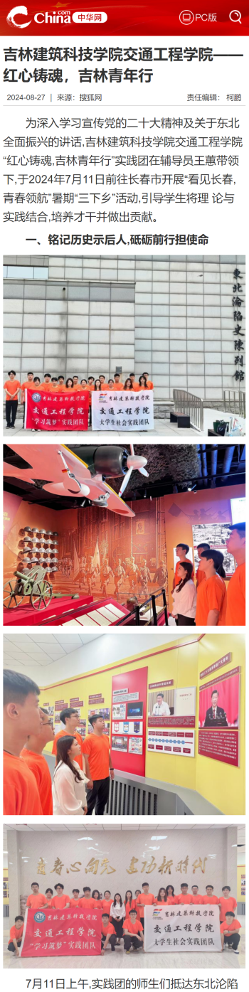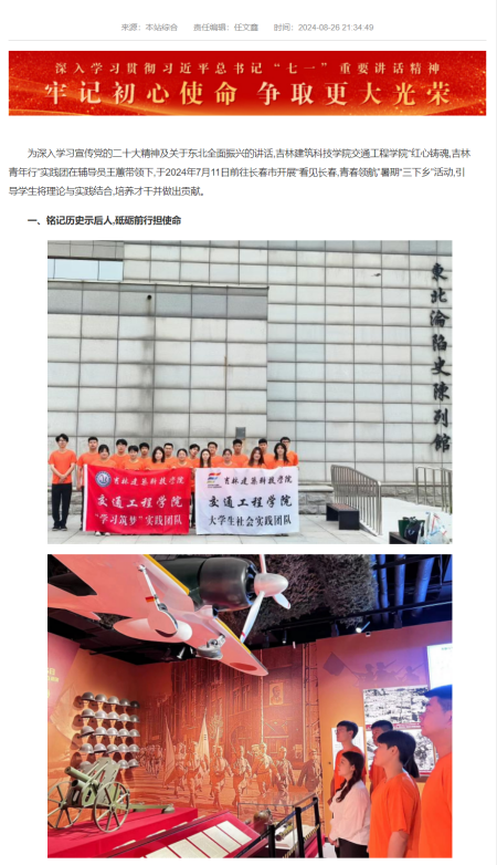 为深入学习宣传党的二十大精神及关于东北全面振兴的讲话,吉林建筑科技学院交通工程学院“红心铸魂,吉林青年行”实践团在辅导员王蕙带领下,于2024年7月11日前往长春市开展“看见长春,青春领航”暑期“三下乡”活动,引导学生将理论与实践结合,培养才干并做出贡献。