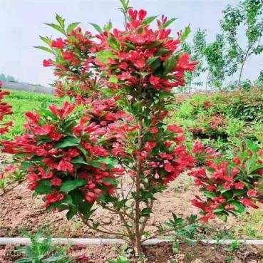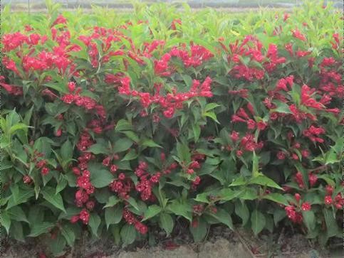 园林用途:红王子锦带株型美观,枝条修长,叶色独特,花朵稠密,花红艳丽,灿如锦带,盛花期孤植株型形似红球,既是在盛花期过后,红花点缀绿叶之中,也甚为美观,因此而得名“红王子”,已成为锦带花的换代品种,具有很高的观赏价值,当年苗即可开花,花期长(5-9月),只要有新叶萌发,就有红花作随。在园林中,既可孤植于庭院、居民小区、广场、公园、草坪中,也可从植于路旁,或可用来做色块,易与其他树种组合搭配。对氟化氢有一定的抗性,因此也可作为工矿区的绿化美化植物。