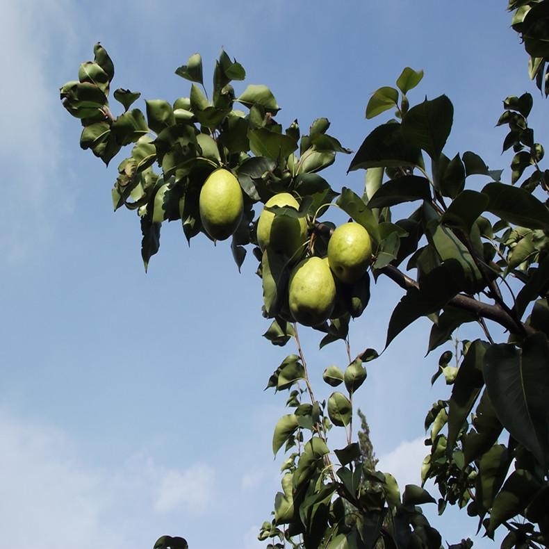 形态特征:乔木,树主干在幼树期树皮光滑,树龄增大后树皮变粗,纵裂或剥落。嫩枝无毛或具有茸毛,后脱落;2年生以上枝灰黄色乃至紫褐色。冬芽具有覆瓦状鳞片,一般为11-18个,花芽较肥圆,呈棕红色或红褐色,稍有亮光,一般为混合芽;叶芽小而尖,褐色。单叶,互生,叶缘有锯齿,托叶早落,嫩叶绿色或红色,展叶后转为绿色;叶形多数为卵或长卵圆形,叶柄长短不一。花为伞房花序,两性花,花瓣近圆形或宽椭圆形,栽培种花柱3-5,子房下位,3-5室,每室有2胚珠。果实有圆、扁圆、椭圆、瓢形等;果皮分黄色或褐色两大类,黄色品种上有些阳面呈红色;秋子梨及西洋梨果梗较粗短,白梨沙梨、新疆梨类果梗一般较长;果肉中有石细胞,内果皮为软骨状;种子黑褐色或近黑色。