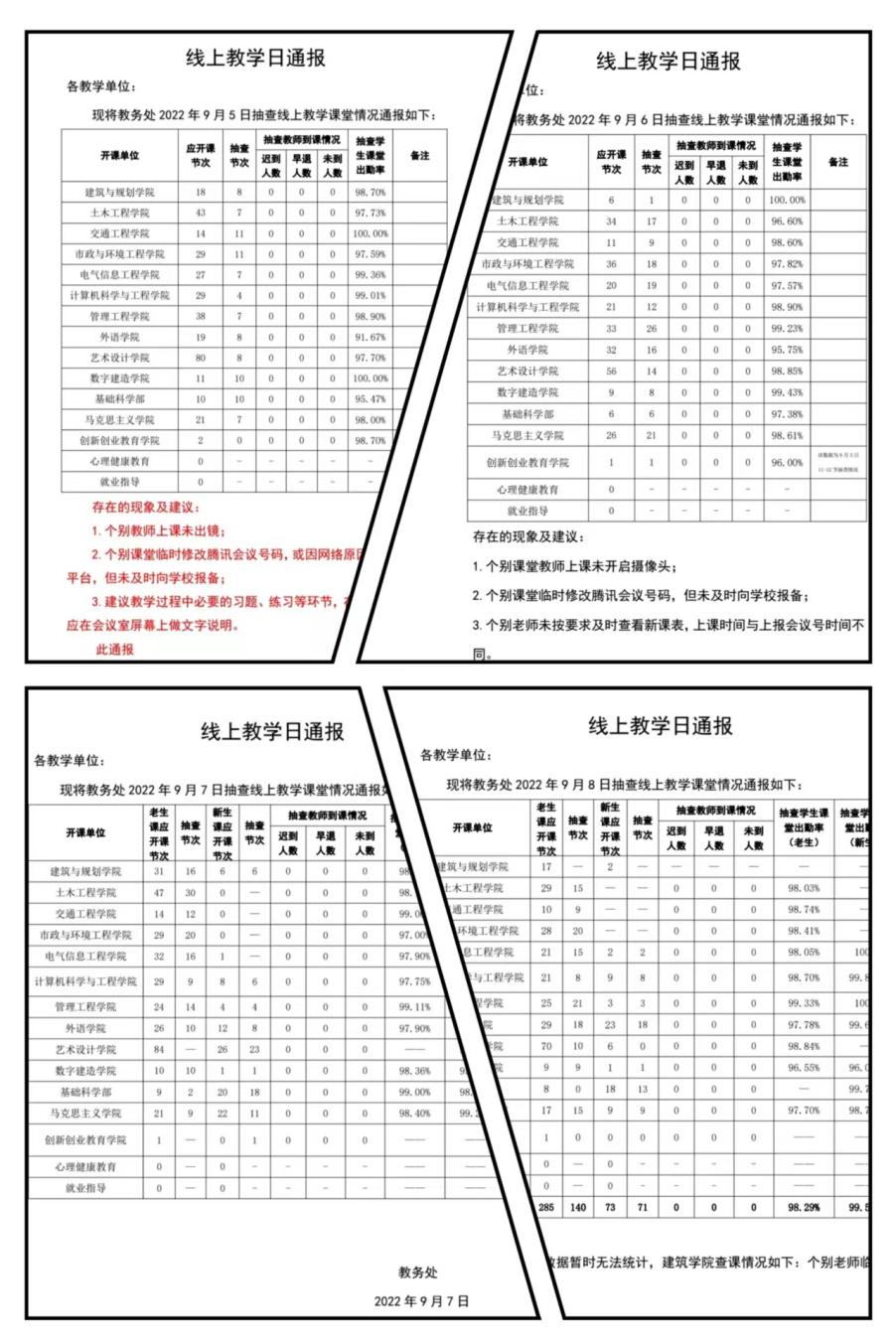 此外,为确保线上教学常态化检查工作的时效性,教务处快速启动反馈机制,通过网络手段第一时间对线上教学平台运行、教师教学及学生学习情况进行及时沟通与反馈。同时,实施“线上教学日通报”制度,每日反馈线上教学抽查监管情况,总结线上教学经验与不足、归纳线上教学亮点与特色、提出针对性问题改进措施等。各教学单位不断夯实主体责任,对发现的问题进行立查立改,持续督促教师认真授课、学生认真上课,为进一步提高学校线上教学质量奠定了坚实基础。
