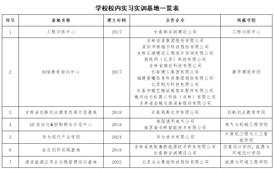 学校坚持“互利共赢、共建共享”的合作理念,与长春建工新吉润建设股份有限公司、浙江陆特能源科技股份公司、美国通用电气(GE)公司等多家企业合作建设了设施一流、特色鲜明的工程训练中心、GE自动化&控制联合示范中心、BIM教育培训中心、华为现代产业学院、清洁能源应用全过程管理实训基地、近零能耗建筑综合智慧能源系统示范实训基地、生态创作实践基地等9个校内实践教学基地。校内实践基地安全、高效,与企业融入度高,设计了110余项虚拟、实模、实操、实训项目,营造了“内外结合、看做结合、学用结合、理实结合、研创结合”的工程创新训练环境。