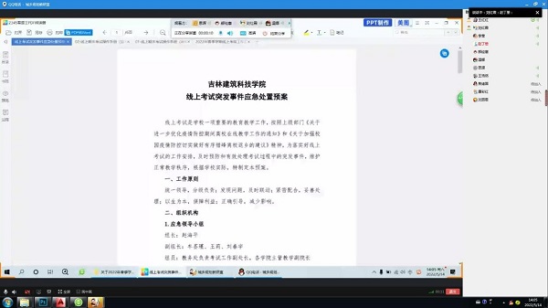 为进一步强化在线教学课程考核全过程管理,最大程度降低疫情对教学工作的影响,根据防控形势和学校实际情况,校教务处下发新修订的2022年春季学期线上考核工作相关文件,其中包含命题教师、监考教师及学生线上考试操作手册等5个文件,建筑设计教研室、建筑技术教研室、城乡规规划教研室展开针对文件的学习活动。
