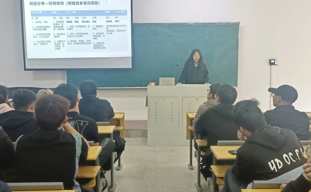 第一个发言的是黄琨尧学姐,她在今年成功上岸了吉林建筑大学。黄学姐以自身经验为例,从学习方法、资料准备等方面向在座同学们分享了考研经验,强调备战考研要加强专业课训练、提高政治敏感度、丰富英语阅读能力。