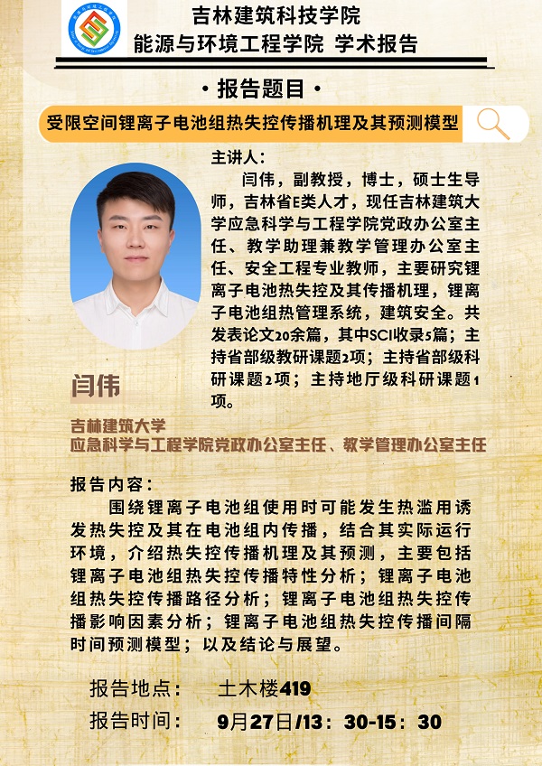 】能源与环境工程学院举办“受限空间锂离子电池组热失控传播机理及其预测模型”学术报告