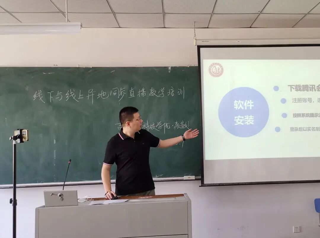 教务处实践教学科曹洪斌老师对线下线上同步直播教学具体操作进行了详细讲解,重点从硬件准备、软件安装、设备调试三个方面进行了现场演示和介绍,同时对腾讯会议软件的课堂教学云录制操作步骤加以说明。