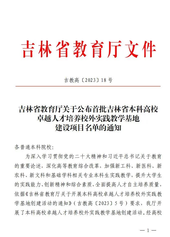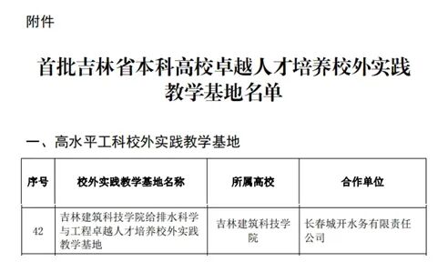 近日,吉林省教育厅发布了《吉林省教育厅关于公布首批吉林省本科高校卓越人才培养校外实践教学基地建设项目名单的通知》(吉教高[2023]18号),我校“给排水科学与工程卓越人才培养校外实践教学基地”获批为首批吉林省本科高校卓越人才培养校外实践教学基地。